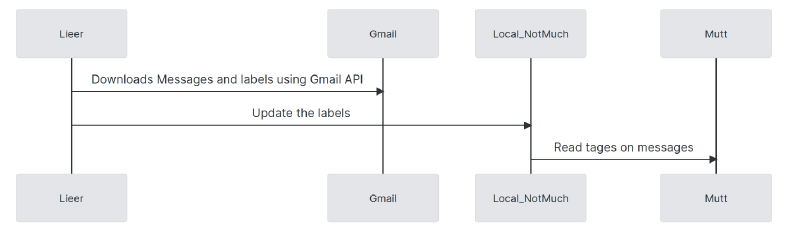 gmibinary) syncs the email and labels between notmuch and the remote gmail account. Gmail has a unique way of managing the labels so lieer is useful. - When sending emails, mutt puts it in the outbox, lieer adds the special gmail tag